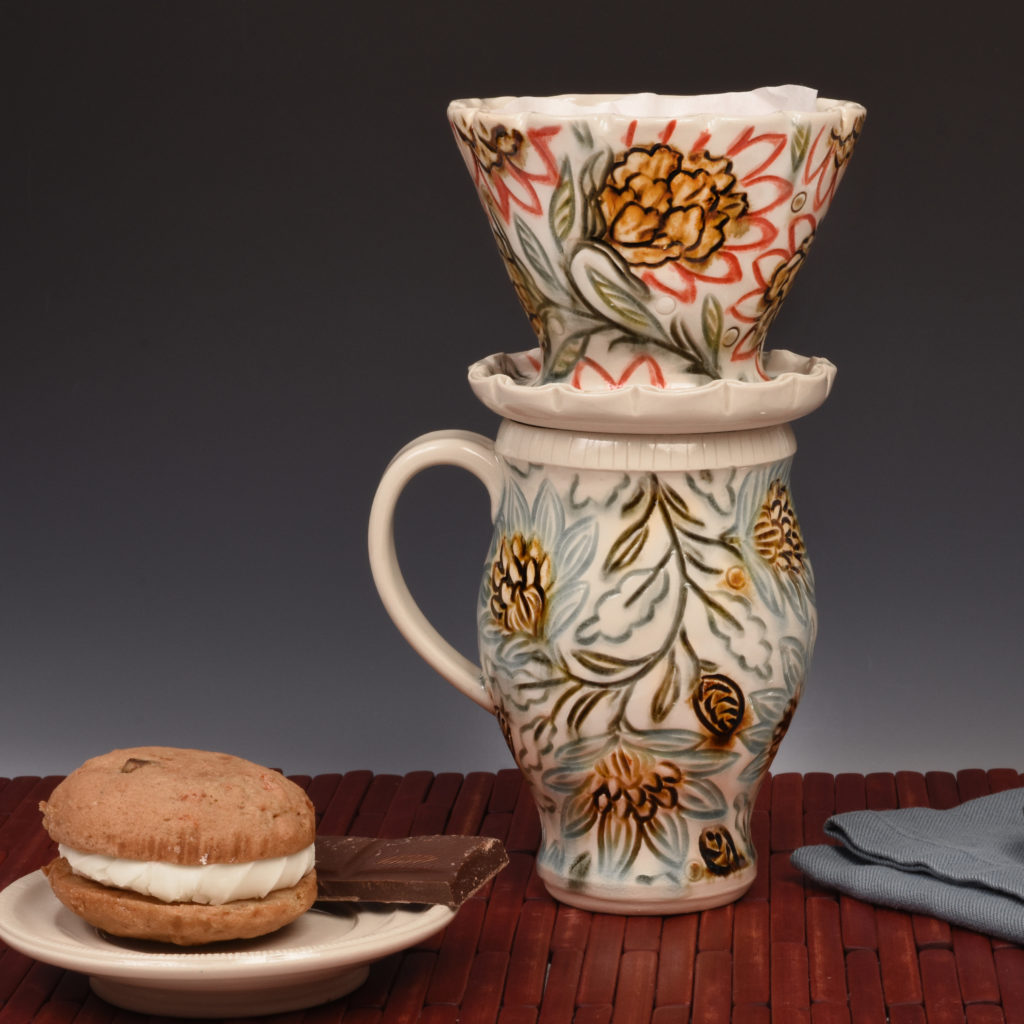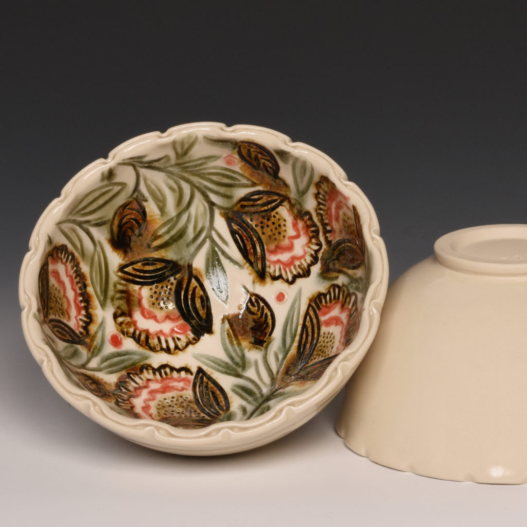 Over the past several years, I have been doing studies of the different botanical symbols seen throughout history and carving them onto white clay vessels. I enjoy the way the patterns and forms engage each other. Though I spend many hours looking at historical motifs, I carve from memory and make my own interpretations. My end goal is to create ornate, utility-based forms that inspire users to engage in slow, deliberate moments of sustenance.